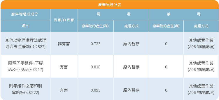 Home > Sustainability > Environmental-廢棄資源管理 Environmental 環境保護與管理 康聯訊堅信企業責任在於技術創新與地球守護。我們承諾節能減碳,積極推動環境永續發展,擬定應對政策及目標, 鑑別及執行成果定期彙整說明,每年至少一次呈報於董事會,由董事會進行監督管理,以應應2050年淨零政策。 環境/氣體管理系統 節能減碳與管理 環境永續 資源再利用 廢棄資源管理 Menu 環境/氣體管理系統 節能減碳與管理 環境永續 資源再利用 廢棄資源管理 產品廢棄物及包材廢棄管理 本公司位於汐止遠東世界中心(下稱園區),園區所有廠戶生活廢棄物均委託專業廠商統一處理。本公司之事業廢棄物則依「公民營廢棄物清除處理機構許可管理辦法」委託具廢棄物清除甲級許可證之專業清運清除機構處理或依再利用相關規定辦理,並依環保署管制規定至環保署網站完成事業廢棄物申報。事業廢棄物出廠時皆會開立清除處理三聯單,運送車輛亦裝置GPS(Global Positioning System)追蹤系統,藉此掌握事業廢棄物流向,並於後續取得合格處理機構開立之妥善處理證明,另有關廢棄物的處理細節部分我們皆謹慎以對,報導期間康聯訊無發生任何廢棄物洩漏事件。本公司提倡廢棄物減量與再利用工作,期能實質減少末端廢棄物產出量,並致力源頭減量及廢棄物再利用技術,以提升廢棄物再利用率。本公司在生產包裝過程中所產生的廢棄物量占比最多,該廢棄物主要是供應商原物料紙箱、TRAY盤、包裝塑膠袋等,佔比約85%,紙箱部分多透過供應商回收再利用,其餘廢棄物合法清運率達100%。下表為康聯訊廢棄物統計表∶ 2024年 2023年 生活廢棄物與水資源管理 本公司營運所在地點位於汐止遠東世界中心(下稱園區),經世界資源研究所的「水資源風險評估工具」(Water Risk Atlas),查詢水資源風險為中低風險區域,主要供水來源取自新山水庫。園區所有廠戶用水均為公共用水,用水部分統一由園區管委會管理,因廠戶水資源共用緣故,無法取得單一廠戶用水量,爰無法提供公司廢水排放總量、用水密度及相關水資源排放檢測等資料。本公司所有廠區及子公司均位於園區C棟,C棟用水狀況如下表,園區管委會隨時注意園區自來水供應狀況,遇有狀況立即提報並提出因應措施及公告廠戶配合節約用水,本公司全面配合管委會,並於2021年至2022年間已全面更換出水量較小之水龍頭,以節約用水。 2024年 遠東世界中心C棟用水統計表月份用水度數用水排放CO2大約公斤數1月932714552月828912933月899814044月821112815月1018315896月1086016947月1244719428月1280719989月13740214310月14630228211月11874185212月104061623合計13177220556 2023年 遠東世界中心C棟用水統計表月份用水度數用水排放CO2大約公斤數1月931014152月892813573月872613264月1031216605月1059317056月1117918007月1175018928月1353021789月14073219510月13708213811月13484210412月112361753合計13682921523 報告期內,康聯訊無任何廢棄物洩漏事件,展現我們對環境的持續承諾。 氣候變遷管理風險策略 每年至少一次呈報於董事會,由董事會進行監督管理,降低潛在風險,以應2050年淨零政策。短期內成本將略增,技術研發需納入氣候變遷並採用創新技術。中/長期成本預期微升,優化ESG、供應鏈與碳排管理,將提升抗風險能力,並在低碳轉型中創造價值。 回選單