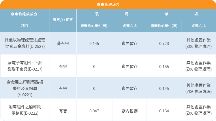 Home > Sustainability > Environmental-廢棄資源管理 Environmental 環境保護與管理 康聯訊堅信企業責任在於技術創新與地球守護。我們承諾節能減碳,積極推動環境永續發展,擬定應對政策及目標, 鑑別及執行成果定期彙整說明,每年至少一次呈報於董事會,由董事會進行監督管理,以應應2050年淨零政策。 環境/氣體管理系統 節能減碳與管理 環境永續 資源再利用 廢棄資源管理 Menu 環境/氣體管理系統 節能減碳與管理 環境永續 資源再利用 廢棄資源管理 產品廢棄物及包材廢棄管理 本公司專注廢棄物減量與再利用,我們專注於源頭減量及再利用技術,提升廢棄物的利用率。包裝過程中,供應商提供的紙箱、托盤與塑膠袋占廢棄物85%,其中紙箱多由供應商回收,其餘廢棄物清運率達100% 生活廢棄物與水資源管理 本公司依《廢棄物清除處理機構許可管理辦法》委託甲級清運機構處理事業廢棄物,並按環保署要求申報。出廠廢棄物以三聯單及GPS追蹤確保透明並取得合格證明。水資源管理由園區管委會統一監控,康聯訊積極響應,於2021年起全面更換低流量水龍頭,以提升用水效率及減少浪費。報告期內,康聯訊無任何廢棄物洩漏事件,展現我們對環境的持續承諾。 氣候變遷管理風險策略 每年至少一次呈報於董事會,由董事會進行監督管理,降低潛在風險,以應2050年淨零政策。短期內成本將略增,技術研發需納入氣候變遷並採用創新技術。中/長期成本預期微升,優化ESG、供應鏈與碳排管理,將提升抗風險能力,並在低碳轉型中創造價值。 回選單