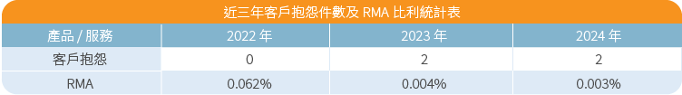 Home > Sustainability > Supply Chain Management-客戶服務支援 Supply Chain Management 供應鏈與產品服務 康聯訊深耕永續供應鏈管理,堅守責任礦產原則,絕不使用非法衝突區礦產。積極推動供應商碳盤查,視其為共創輝煌的核心夥伴, 攜手並進、共同成長。無論新舊合作,皆致力於建立長期穩定的全球永續夥伴關係,打造堅不可摧的綠色供應鏈。 產品品質管理系統 供應鏈管理 產品與服務 客戶服務支援 Menu 產品品質管理系統 供應鏈管理 產品與服務 客戶服務支援 客戶支援 如果客戶發現問題,我們的團隊將立即提供支持,找出根源,徹底分析並採取對策,防止再次發生。康聯訊重視客戶反饋,通過數據分析,不斷完善品質保證系統,確保為客戶提供優質產品和服務。 滿意度調查比較 定期針對客戶滿意度進行問卷調查,內容涵蓋價格、產品品質、交期、訊息回覆、產品技術支援、市場資訊等問題,經統計分析後,相關部門需針對客戶不滿意情形,一個月內要提出改善計畫。 針對單項得分低於70分的不滿意情況,我們會及時回饋給客戶。客戶評分結果總分低於70分,將該客戶列為重點改善,業務要深入了解客戶不滿意原因且列改善進度,隨時向客戶報告進度。 2024年平均整體滿意度分數85.2分較2023年平均分數86.2分提高,滿意度調查略微降低主要在交期符合性及市場訊息提供,改善交期符合性對策,若客戶需求產品屬於特殊產品規格,不定期與客戶更新專案進度,了解客戶對專案把握程度,視情況提早備料;市場訊息有落差自2024/5起,Marketing會準備Monthly news給業務,並由業務協助以mail方式發放給各客戶作為參考。我們將致力於落後指標改進且繼續秉持以客戶為中心的理念,不斷優化產品和服務,為客戶提供更優質的體驗。 客戶抱怨 康聯訊對產品高品質要求反映在極低客戶抱怨次數及維修服務費用如下: 回選單